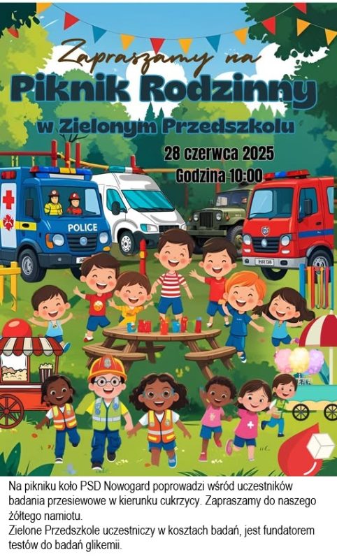 28 czerwca 2025 r. zapraszamy do naszego żółtego namiotu na badania przesiewowe w kierunku cukrzycy w Zielonym Przedszkolu w Nowogardzie. W odpowiedzi na złożone zaproszenie do udziały w Pikniku Rodzinnym w Zielonym Przedszkolu, koło PSD Nowogard poprowadzi wśród uczestników pikniku badania przesiewowe w kierunku cukrzycy. Zielone Przedszkole jest fundatorem testów do badań glikemii.