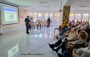 Z uwagi na powracający w ostatnim czasie proceder oszustw, który dotyka starsze pokolenie w dniu 27 listopada 2023 r. odbyło się spotkanie w Miejskiej Bibliotece Publicznej w Nowogardzie, w którym uczestniczył Pan Robert Czapla- Burmistrz Nowogardu, przedstawiciele Urzędu Miejskiego w Nowogardzie oraz funkcjonariusze Komisariatu Policji w Nowogardzie. Głównym celem spotkania było budowanie społeczności świadomych i bezpiecznych seniorów, którzy czują się pewnie zarówno w świecie rzeczywistym, jak i w wirtualnej przestrzeni. Przedstawiciele nowogardzkiej Policji w trakcie spotkania podzielili się swoją wiedzą na temat oszustw internetowych oraz tradycyjnych. Rozmawiali o nowoczesnych zagrożeniach oraz o tym, jak rozpoznawać i unikać potencjalnych niebezpieczeństw. Seniorzy otrzymali cenne i praktyczne wskazówki dotyczące bezpiecznych praktyk online. Rozmowy o bezpieczeństwie obejmowały także aspekty ekonomiczne. Policjanci podzielili się informacjami na temat aktualnych zagrożeń związanych z finansami oraz jak należy unikać sytuacji, które mogą zagrażać stabilności finansowej. Główną tematyką były tradycyjne oszustwa, które niestety nadal są obecne w społeczeństwie. Policjanci omówili sposób działania sprawców wyłudzeń finansowych „na wnuczka” czy „na policjanta” oraz udzielili praktycznych wskazówek, jak unikać i rozpoznać pułapki związane z tymi oszustwami. Funkcjonariusze przestrzegli również seniorów przed próbami oszustw internetowych, które mogą nasilić się w okresie świątecznym. W spotkaniu uczestniczyli również członkowie PSD koła Nowogard