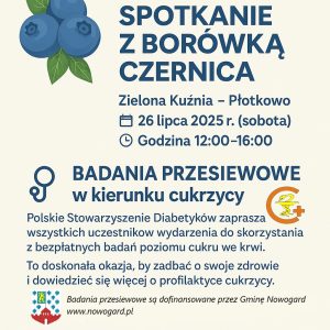 W Zielonej Kuźni w Płotkowie, podczas Spotkania z Borówką Czernicą organizowanego przez Nadleśnictwo Nowogard 26 lipca 2025 roku w godzinach 12:00–16:00, Polskie Stowarzyszenie Diabetyków zaprosi uczestników do udziału w badaniach przesiewowych w kierunku cukrzycy. Akcja badań przesiewowych jest dofinansowana przez Gminę Nowogard –www.nowogard.pl.