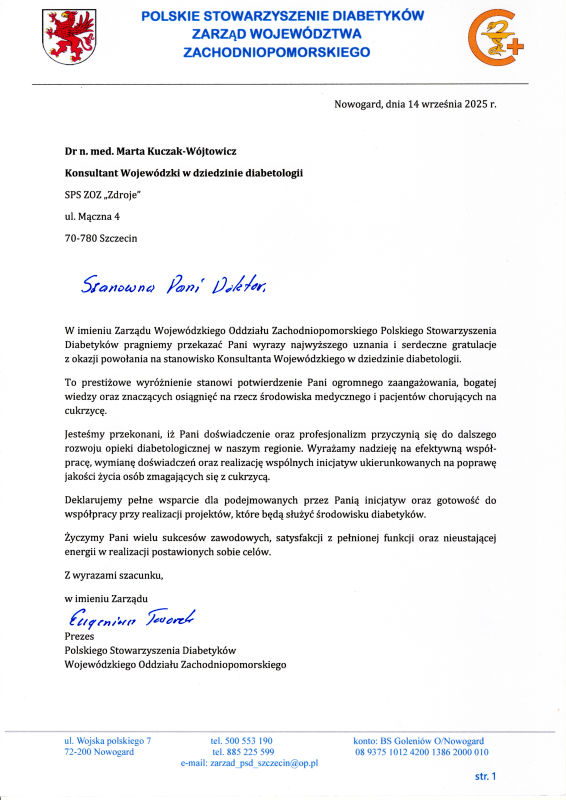 Zarząd Wojewódzkiego Oddziału Zachodniopomorskiego Polskiego Stowarzyszenia Diabetyków składa Pani dr n. med. Marcie Kuczak- Wójtowicz gratulacje i życzy owocnej pracy na rzecz zachodniopomorskich diabetyków .